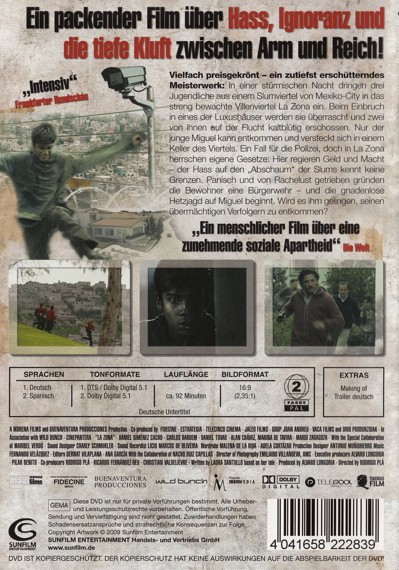 In einer stürmischen Nacht dringen drei Jugendliche aus einem Slumviertel von Mexiko-City in das streng bewachte Villenviertel La Zona ein. Beim Einbruch in eines der Luxushäuser werden sie überrascht und zwei von ihnen auf der Flucht kaltblütig erschossen. Nur der junge Miguel kann entkommen und versteckt sich in einem Keller des Viertels. Ein Fall für die Polizei, doch in La Zona herrschen eigene Gesetze: Hier regieren Geld und Macht der Hass auf den "Abschaum" der Slums kennt keine Grenzen. Panisch und von Rachelust getrieben gründen die Zonen-Bewohner eine Bürgerwehr, und die gnadenlose Hetzjagd auf Miguel beginnt. Wird es ihm gelingen, seinen übermächtigen Verfolgern zu entkommen?