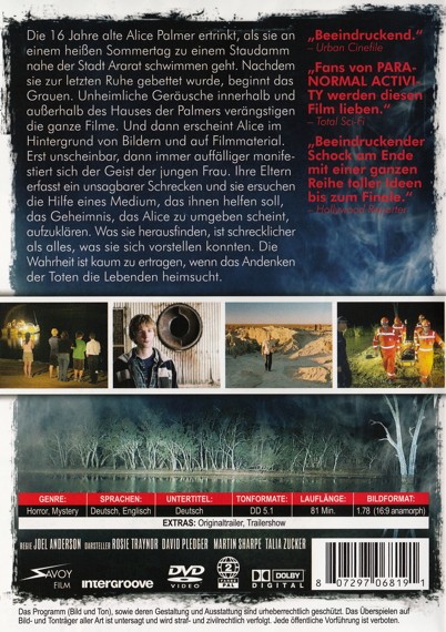 Die 16 Jahre alte Alice Palmer ertrinkt, als sie an einem heissen Sommertag zu einem Staudamm nahe der Stadt Ararat schwimmen geht. Nachdem sie zur letzten Ruhe gebettet wurde, beginnt das Grauen. Unheimliche Geräushe innerhalb und ausserhalb der Hauses der Palmers verängstigen die ganze Filme. Und dann erscheint Alice im Hintergrund von Bildern und auf Filmmaterial. Erst unscheinbar, dann immer auffälliger manifestiert sich der Geist der jungen Frau. Ihre Eltern erfasst ein unsagbarer Schrecken und sie ersuchen die Hilfe eines Medium, das ihnen helfen soll, das Geheimnis, das Alice zu umgeben scheint, aufzuklären. Was sie herausfinden, ist schrecklicher als alles, was sie sich vorstellen konnten. Die Wahrheit ist kaum zu ertragen, wenn das Andenken der toten die Lebenden heimsucht.