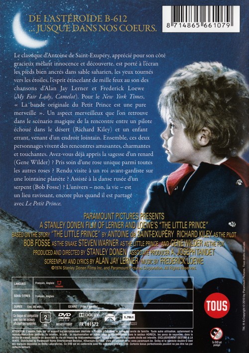 Le célèbre personnage d'Antoine de Saint-Exupéry, mélange d'innocence et d'amour, prend vie dans ce merveilleux film musical réalisé par Stanley Donen. Ses traces de pas s'inscrivent sur les dunes du Sahara et son regard se plonge dans l'infini du ciel étoilé, accompagnés par les chansons de Alan Jay Lerner et Frederick Loewe.