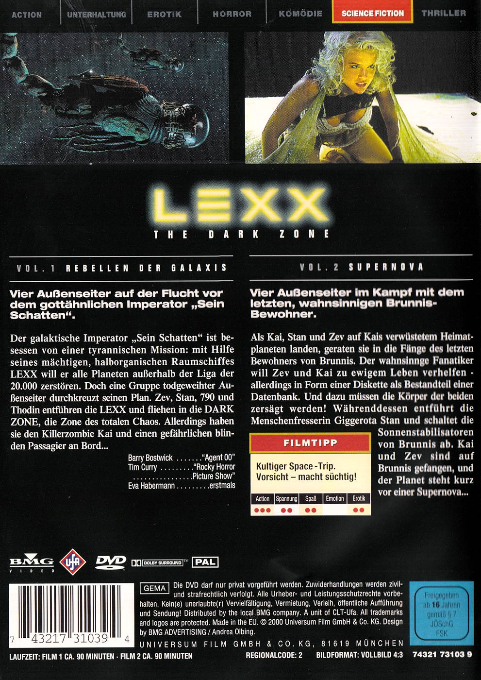 Der galaktische Imperator "Sein Schatten" ist besessen von einer tyrannischen Mission: Mit Hilfe seines mächtigen, halborganischen Raumschiffes LEXX, will er alle Planeten ausserhalb der Liga der 20.000 zerstören. Doch eine Gruppe totgeweihter Aussenseiter durchkreuzen seinen Plan. Zev, Stan, 790 und Thodin entführen das LEXX und fliehen in die "Dark Zone", die Zone des totalen Chaos. Allerdings haben sie den Killerzombie Kai und einen gefährlichen, blinden Passagier an Bord...