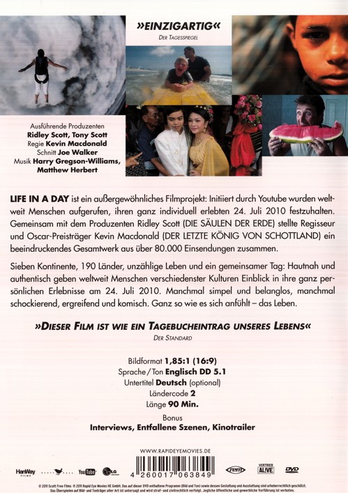 "Life In A Day" ist ein außergewöhnliches Filmprojekt: Initiiert durch Youtube wurden weltweit Menschen aufgerufen, ihren ganz individuell erlebten 24. Juli 2010 festzuhalten. Gemeinsam mit dem Produzenten Ridley Scott (Die Säulen der Erde) stellt Regisseur und Oscar-Preisträger Kevin Macdonald (Der letzte König von Schottland) ein beeindruckendes Gesamtwerk aus über 80.000 Einsendungen zusammen.