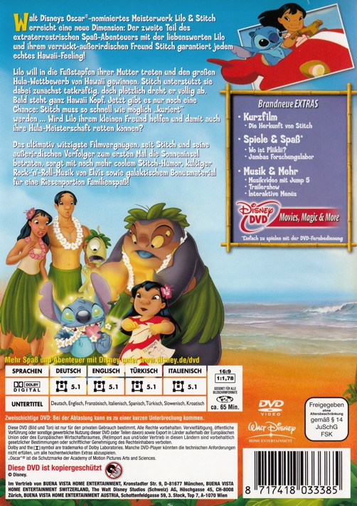 Walt Disneys Oscar-nominiertes Meisterwerk Lilo & Stitch erreicht eine neue Dimension: Der zweite Teil des extraterrestrischen Spass-Abenteuers mit der liebenswerten Lilo und ihrem verrückt-ausserirdischen Freund Stitch garantiert jedem echtes Hawaii-Feeling!