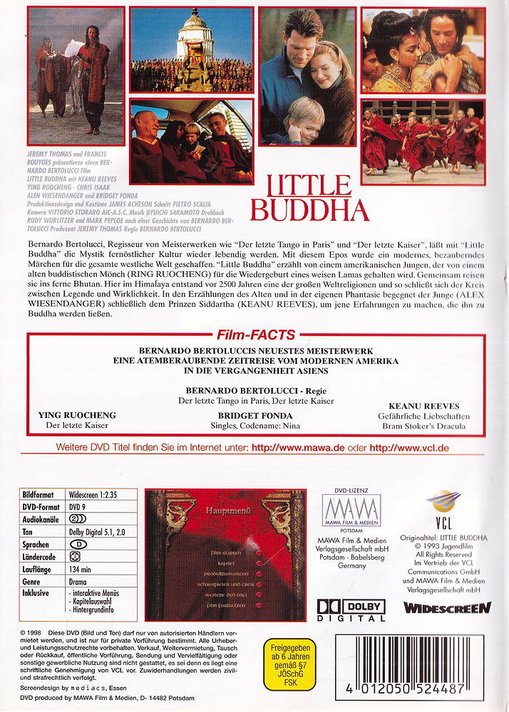 Bernardo Bertolucci, Regisseur von Meisterwerken wie Der letzte Tango in Paris und Der letzte Kaiser, lässt mit Little Buddha die Mystik fernöstlicher Kultur wieder lebendig werden. Mit diesem Epos wurde ein modernes, bezauberndes Märchen für die gesamte westliche Welt geschaffen. Little Buddha erzählt von einem amerikanischen Jungen, der von einem alten buddhistischen Mönch ( YING RUOCHENG) für die Wiedergeburt eines weisen Lamas gehalten wird. Gemeinsam reisen sie ins ferne Bhutan. Hier im Himalaya, entstand vor 2500 Jahren eine grosse Weltreligion und so schliesst sich der Kreis zwischen Legende und Wirklichkeit. In den Erzählungen des Alten und in der eigenen Phantasie, begegnet der Junge (ALEX WIESENDANGER) schliesslich dem Prinzen Siddhartha (KEANU REEVES), um jene Erfahrungen zu machen, die ihn zu Buddha werden liessen.