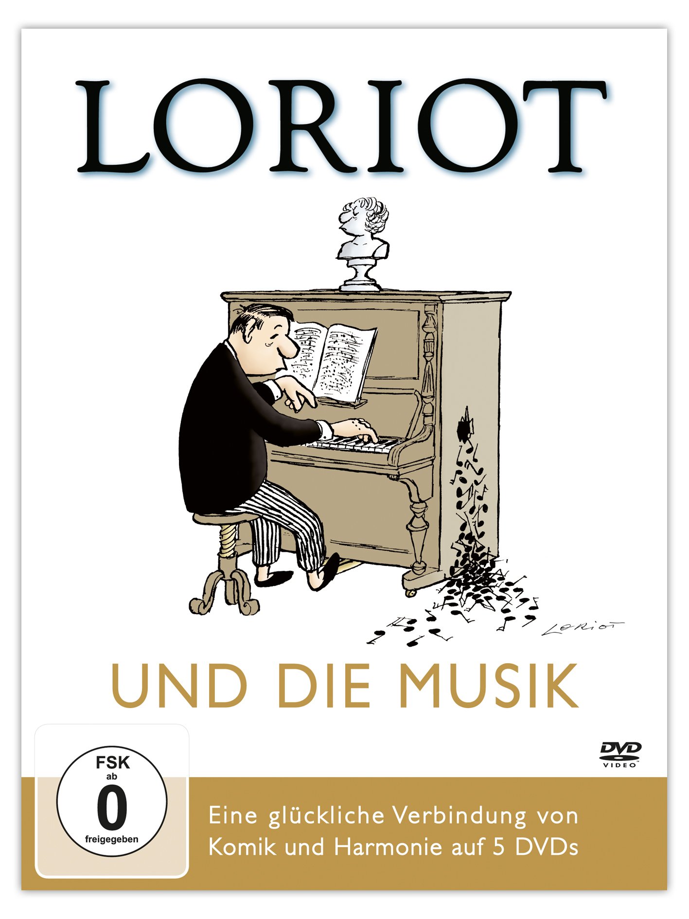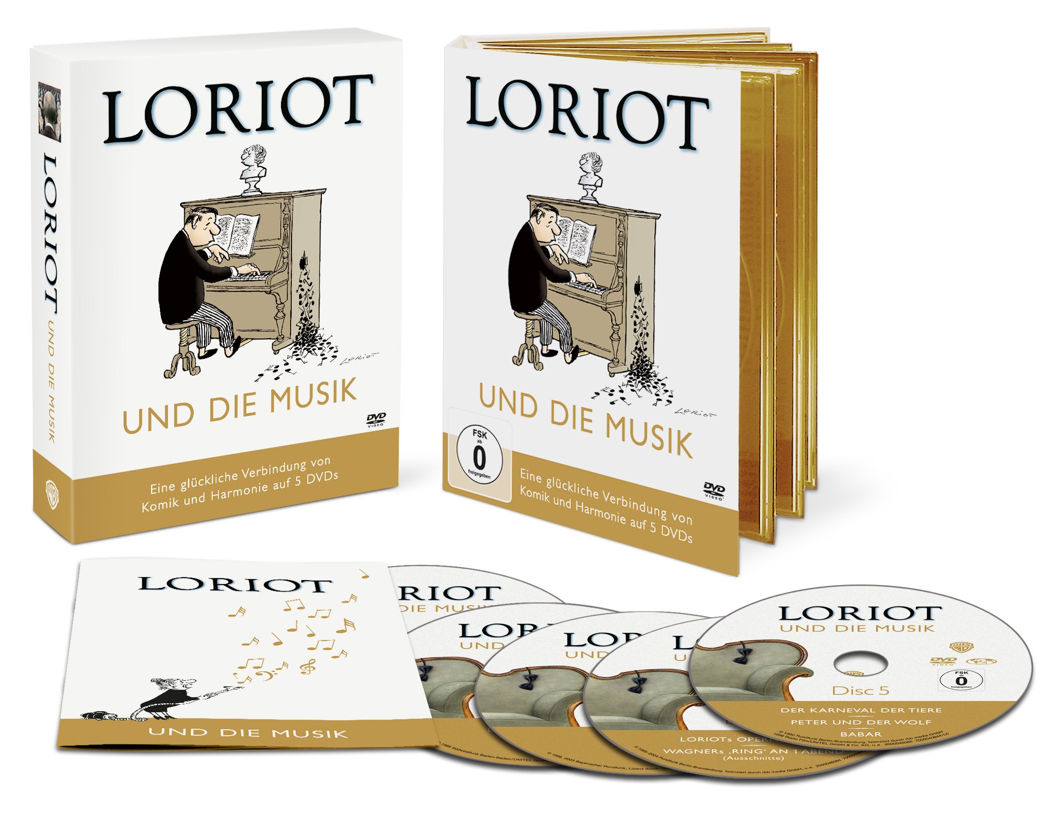 Die glückliche Verbindung von Komik und Harmonie auf fünf DVDs! Musik ist die grosse Leidenschaft des Meisters des feinsinnigen Humors. In seiner unnachahmlichen Art feiert er auf Opern- und Konzertbühnen grosse Erfolge. Nun gibt es Loriots musikalisches Werk endlich vollständig als DVD-Edition. Die Sammlung hat eine Spieldauer von insgesamt 710 Minuten, enthält ein 20-seitiges Begleitbooklet und ist in einem wertvollen Schuber verpackt. Loriots einzigartiger Opernführer ist ebenso in dieser Sammlung enthalten wie seine Inszenierungen, z. B. Martha, Der Freischütz oder Wagners Ring an einem Abend. Einer der Höhepunkte von Loriots Konzertauftritten ist die von ihm bearbeitete und vorgetragene Fassung von Leonard Bernsteins Candide, deren Aufführung das Publikum immer wieder begeistert. Unter den zahlreichen Extras, die über vier Stunden umfassen, finden sich viele Dokumentationen, Interviews, Begegnungen mit berühmten Musikern sowie die Musikalischen Sketche. All das wurde von Loriot selbst in Zusammenarbeit mit Stefan Lukschy herausgegeben und ist ein Muss für wahre Loriotfans.