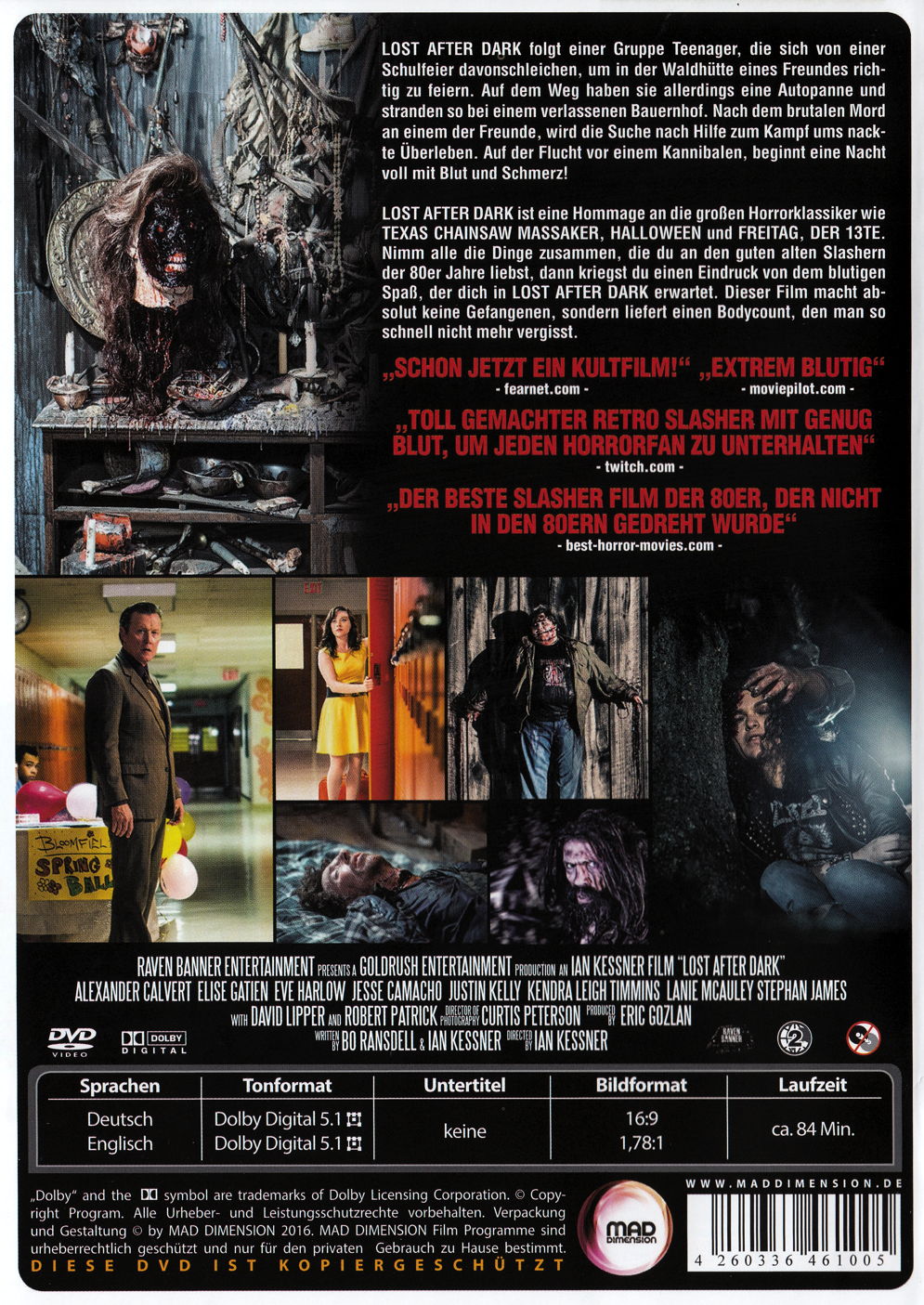 Lost After Dark folgt einer Gruppe Teenager, die sich von einer Schulfeier davonschleichen, um in der Waldhütte eines Freundes richtig zu feiern. Auf dem Weg haben sie allerdings eine Autopanne und stranden so bei einem verlassenen Bauernhof. Nach dem brutalen Mord an einem der Freunde, wird die Suche nach Hilfe zum Kampf ums nackte Überleben. Auf der Flucht vor einem Kannibalen, beginnt eine Nacht voll mit Blut und Schmerz!