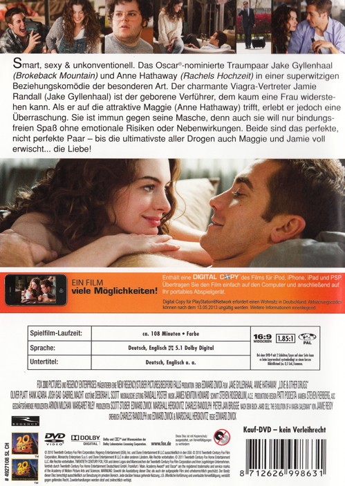 Smart, sexy & unkonventionell. Das Oscar-nominierte Traumpaar Jake Gyllenhaal (Brokeback Mountain) und Anne Hathaway (Rachels Hochzeit) in einer superwitzigen Beziehungskomödie der besonderen Art. Der charmante Viagra-Vertreter Jamie Randall (Jake Gyllenhaal)ist der geborene Verführer, dem kaum eine Frau widerstehen kann. Als er auf die attraktive Maggie (Anne Hathaway) trifft, erlebt er jedoch eine Überraschung. Sie ist immun gegen seine Masche, denn auch sie will nur bindungsfreien Spass ohne emotionale Risiken oder Nebenwirkungen. Beide sind das perfekte, nicht perfekte Paar - bis die ultimative aller Drogen auch Maggie und Jamie voll erwischt... die Liebe!