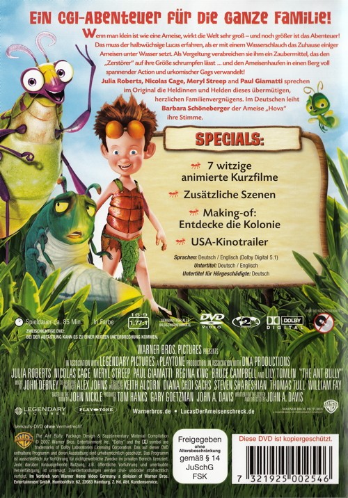 und den Ameisenhaufen in einen Berg voll spannender Action und urkomischer Gags verwandelt! Julia Roberts, Nicolas Cage, Meryl Streep und Paul Giamatti sprechen im Original die Heldinnen und Helden dieses übermütigen, herzlichen Familienvergnügens.