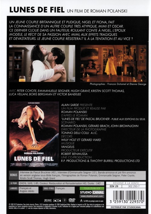 Un jeune couple britannique et pudique, Nigel et Fiona, fait la connaissance d'un autre couple très atypique, Mimi et Oscar. Ce dernier cloué dans un fauteuil roulant conte à Nigel, l'époux modèle, le récit de sa passion avec Mimi, aux effets tragiques et dévastateurs. Le jeune couple résistera t'il à la tentation et au vice ?