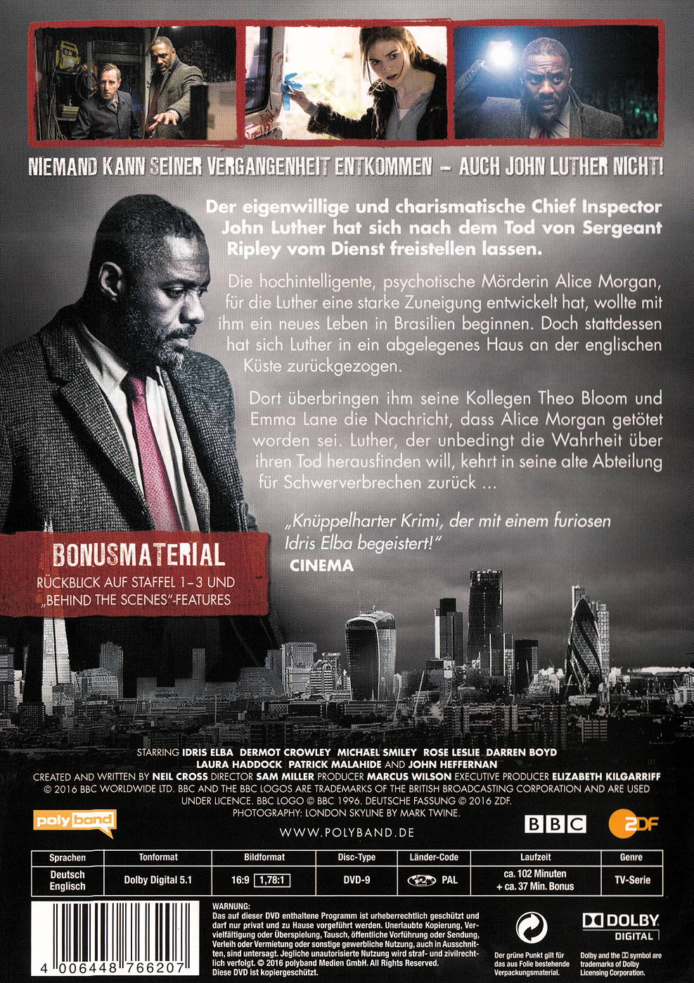 Der eigenwillige und charismatische Chief Inspector John Luther hat sich nach dem Tod von Sergeant Ripley, seinem engsten Kollegen, vom Dienst freistellen lassen. Die hochintelligente, psychotische Mörderin Alice Morgan, für die Luther eine starke Zuneigung entwickelt hat, wollte mit ihm ein neues Leben in Brasilien beginnen. Doch stattdessen hat sich Luther in ein abgelegenes Haus an der englischen Küste zurückgezogen. Dort überbringen ihm seine Kollegen Theo Bloom und Emma Lane die Nachricht, dass Alice Morgan nach einer Auseinandersetzung mit Gangstern in Antwerpen getötet worden sei. Luther, der unbedingt die Wahrheit über ihren Tod herausfinden und das Rätsel lösen will, kehrt in seine alte Abteilung für Schwer- und Serienverbrechen zurück.