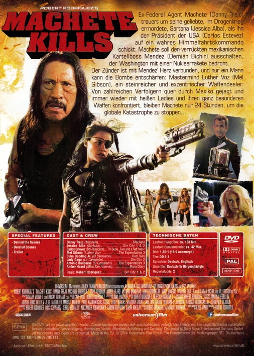 Der Zünder ist mit Mendez' Herz verbunden, und nur ein Mann kann die Bombe entschärfen: Mastermind Luther Voz, ein steinreicher und exzentrischer Waffendealer mit Allmachtsfantasien. Von zahlreichen Verfolgern quer durch Mexiko gejagt und immer wieder konfrontiert mit heissen Ladies und ihren ganz besonderen Waffen, bleiben Machete ganze 24 Stunden, um die globale Anarchie zu stoppen...