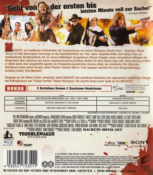 Machete, ein knallharter Actionthriller mit Starbesetzung von Robert Rodriguez (Death Proof - Todsicher, Planet Terror), ist eine überzogene Hommage an die Exploitationfilme der 70er Jahre. Hauptdarsteller sind Danny Trejo als mexikanischer Bundespolizist, der an einem kaltblütigen Drogenbaron (Steven Seagal), einem skrupellosen Mitglied der Bürgerwehr (Don Johnson) und einem machtversessenen Politiker (Robert De Niro) Rache üben will. Unterstützung erfährt er dabei durch eine ausgebuffte Agentin der Einwanderungsbehörde (Jessica Alba), die rebellische She (Michelle Rodriguez) sowie seinen Bruder, einen Priester (Cheech Marin). Trost dagegen spendet ihm eine Drogenabhängige (Lindsay Lohan). Viva Machete!