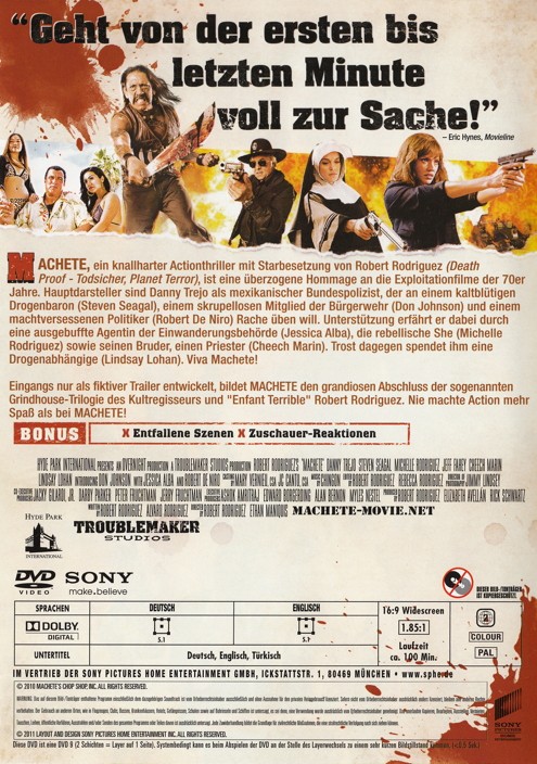 Machete, ein knallharter Actionthriller mit Starbesetzung von Robert Rodriguez (Death Proof - Todsicher, Planet Terror), ist eine überzogene Hommage an die Exploitationfilme der 70er Jahre. Hauptdarsteller sind Danny Trejo als mexikanischer Bundespolizist, der an einem kaltblütigen Drogenbaron (Steven Seagal), einem skrupellosen Mitglied der Bürgerwehr (Don Johnson) und einem machtversessenen Politiker (Robert De Niro) Rache üben will. Unterstützung erfährt er dabei durch eine ausgebuffte Agentin der Einwanderungsbehörde (Jessica Alba), die rebellische She (Michelle Rodriguez) sowie seinen Bruder, einen Priester (Cheech Marin). Trost dagegen spendet ihm eine Drogenabhängige (Lindsay Lohan). Viva Machete!