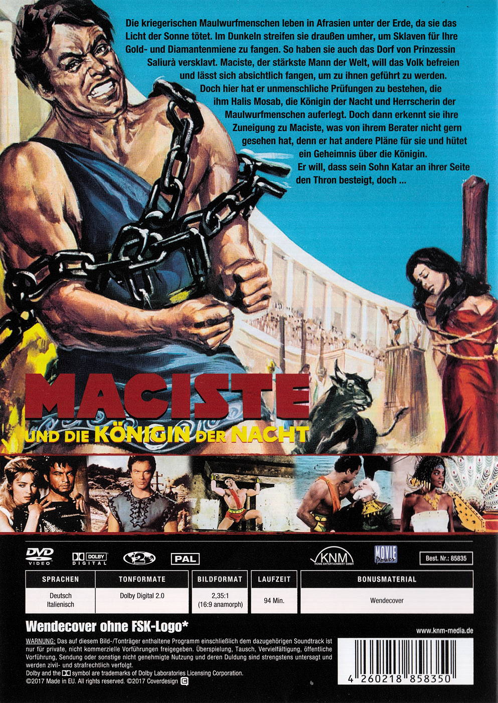 Die kriegerischen Maulwurfmenschen leben in Afrasien unter der Erde, da sie das Licht der Sonne tötet. Im Dunkeln streifen sie draussen umher, um Sklaven für Ihre Gold- und Diamantenmiene zu fangen. So haben sie auch das Dorf von Prinzessin Saliurà versklavt. Maciste, der stärkste Mann der Welt, will das Volk befreien und lässt sich absichtlich fangen, um zu ihnen geführt zu werden. Doch hier hat er unmenschliche Prüfungen zu bestehen, die ihm Halis Mosab, die Königin der Nacht und Herrscherin der Maulwurfmenschen auferlegt. Doch dann erkennt sie ihre Zuneigung zu Maciste, was von ihrem Berater nicht gern gesehen hat, denn er hat andere Pläne für sie und hütet ein Geheimnis über die Königin. Er will, dass sein Sohn Katar an ihrer Seite den Thron besteigt, doch...
