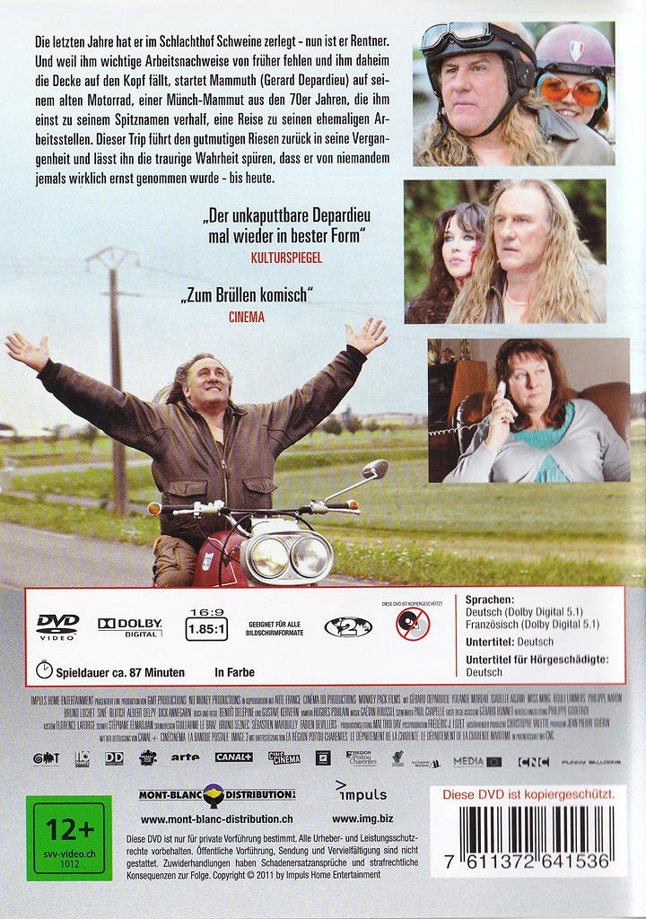 Die letzten Jahre hat er im Schlachthof Schweine zerlegt – nun ist er Rentner. Und weil ihm wichtige Arbeitsnachweise von früher fehlen und ihm daheim die Decke auf den Kopf fällt, startet Mammuth (Gérard Depardieu) auf seinem alten Motorrad, einer Münch-Mammut aus den 70er Jahren, die ihm einst zu seinem Spitznamen verhalf, eine Reise zu seinen ehemaligen Arbeitsstellen.