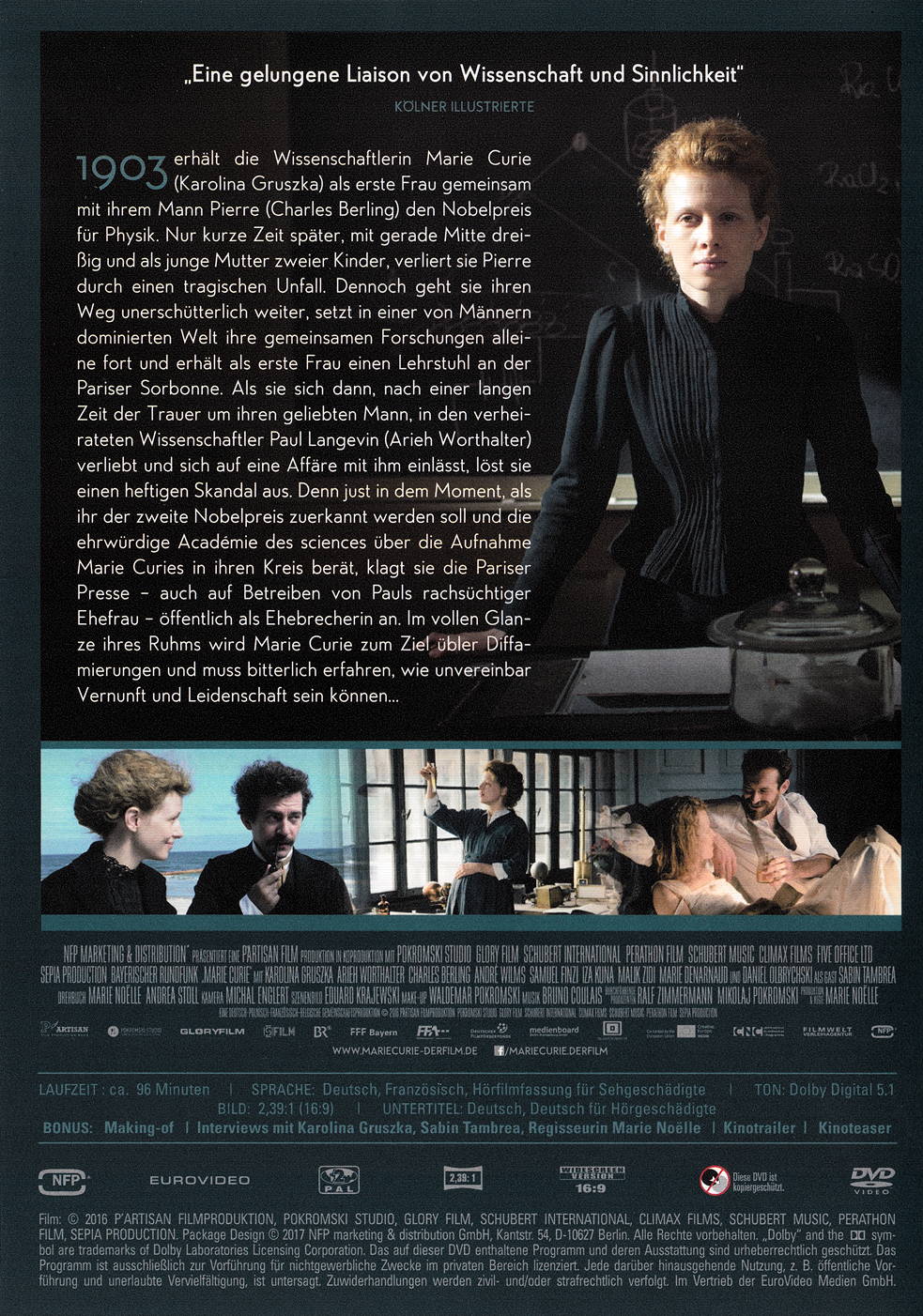 Die Geschichte: 1903 erhält die Wissenschaftlerin Marie Curie als erste Frau gemeinsam mit ihrem Mann Pierre den Nobelpreis für Physik. Nur kurze Zeit später, mit gerade Mitte Dreissig und als junge Mutter zweier Kinder, verliert sie Pierre durch einen tragischen Unfall. Dennoch bahnt sie sich ihren Weg unerschütterlich weiter, setzt in einer von Männern dominierten Welt ihre gemeinsamen Forschungen alleine fort und erhält als erste Frau einen Lehrstuhl an der Pariser Sorbonne. Als sie sich dann, nach einer langen Zeit der Trauer um ihren geliebten Mann, in den verheirateten Wissenschaftler Paul Langevin verliebt und sich auf eine Affäre mit ihm einlässt, löst sie einen heftigen Skandal aus. Denn just in dem Moment, als ihr der zweite Nobelpreis zuerkannt werden soll und die ehrwürdige Académie des sciences über die Aufnahme Marie Curies in ihren Kreis berät, klagt sie die Pariser Presse - auch auf Betreiben von Pauls rachsüchtiger Ehefrau - öffentlich als Ehebrecherin an. Im vollen Glanze ihres Ruhms wird Marie Curie zum Ziel übler Diffamierungen und muss bitterlich erfahren, wie unvereinbar Vernunft und Leidenschaft sein können...