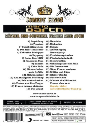 5) Fabrazios Schlüpper Revivalparty 6) Boygroup 22) Fruchtzwergebecher 7) Bahn; Bus; LKW 23) Fününününününüh 8) Frauen im Stau 24) Menstruation 9) Subtext 25) Geheimsprache der Frau 10) Kalte Füsse 26) Die Dosenwurst 11) Männer haben 27) Wenn Frauen meckern auch Gefühle 28) Mütter und Väter 12) Möhreneintopf 29) Kleiner Bruder 13) Am Anfang der Beziehung 30) Das erste Mal 14) Ich musste kacken 31) Männer sind Schweine, 15) Frauen und ihre Fragen 16) Frauen haben's einfacher 17) Der Urlaub Frauen aber auch Zugabe: bisher unveröffentlichter Stand up
