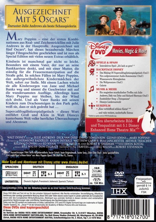 Kindsein ist manchmal gar nicht so leicht. Besonders mit einem Vater, der nur an seine Bank-Karriere denkt, und mit einer Mutter, die ständig für die Frauenemanzipation auf die Strasse geht. In solchen Fällen ist Mary Poppins, das außergewöhnlichste Kindermädchen der Welt, sofort zur Stelle. Mit einem Lachen wischt sie alle Kindersorgen von Jane und Michael Banks weg und nimmt die Geschwister mit auf die wundersamsten Ausflüge. Allerdings kann Mary Poppins nur bleiben, bis der Wind sich dreht. Und als Vater Banks mit seinen Kindern zum Drachensteigen in den Park geht, weiß sie, dass er sich gedreht hat...