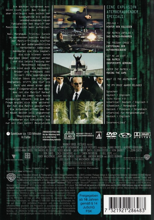 Wenn dieser Krieg schon morgen vorbei sein könnte? Lohnt es sich nicht dafür zu kämpfen? Und zu sterben? Thomas "Neo" Anderson traf eine schwer wiegende Entscheidung, als er bewusst jene Frage stellte, die auch Morpheus und Trinity zuvor gestellt hatten. Um die Wahrheit zu suchen und zu akzeptieren. Um seinen Verstand aus den Fesseln der Matrix zu befreien. Alles beginnt mit einer Entscheidung. Jetzt, im zweiten Kapitel der "Matrix"-Trilogie, bekommt Neo seine aussergewöhnlichen Fähigkeiten besser in den Griff, während Zion von der Maschinenarmee belagert wird. Nur noch wenige Stunden bleiben, bis die letzte Fluchtburg der Menschen von 250.000 Wächtern angegriffen wird, die laut Programmierung alles menschliche Leben vernichten sollen. Doch die Bürger von Zion haben Hoffnung geschöpft: Morpheus überzeugt sie, dass der Erwählte die Prophezeiung des Orakels erfüllen und den Krieg gegen die Maschinen beenden wird. Die Menschen glauben an Neo, der von beunruhigenden Visionen heimgesucht wird, während er versucht, einen Aktionsplan zu entwickeln.
