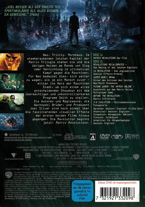 Neo. Trinity. Morpheus. Im atemberaubenden letzten Kapitel der Matrix Trilogie stehen sie und die übrigen Helden am Rande von Sieg oder Vernichtung im ultimativen Kampf gegen die Maschinen. Für Neo bedeutet dies, sich weiter zu wagen, als je ein Mensch zuvor - mitten ins Herz der Maschinen Stadt, um sich einem alles entscheidenden Showdown mit dem übermächtigen und unkontrollierbaren Programm Smith zu stellen.