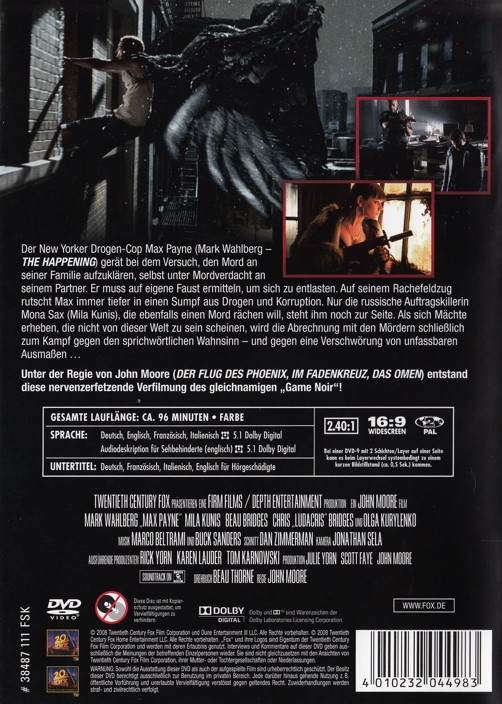 Der New Yorker Drogen-Cop Max Payne (Mark Wahlberg - The Happening) gerät bei dem Versuch, den Mord an seiner Familie aufzuklären, selbst unter Mordverdacht an seinem Partner. Er muss auf eigene Faust ermitteln, um sich zu entlasten. Auf seinem Rachefeldzug rutscht Max immer tiefer in einen Sumpf aus Drogen und Korruption. Nur die russische Auftragskillerin Mona Sax (Mila Kunis), die ebenfalls einen Mord rächen will, steht ihm noch zur Seite. Als sich Mächte erheben, die nicht von dieser Welt zu sein scheinen, wird die Abrechnung mit den Mördern schliesslich zum Kampf gegen den sprichwörtlichen Wahnsinn - und gegen eine Verschwörung von unfassbaren Ausmassen...