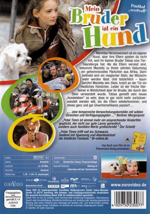 Den kleinen Bruder doof findet die zehnjährige vernachlässigte Marietta, leidet unter der Ehekrise ihrer Eltern und wünscht sich sehnlichst einen kleinen Hund. Als Papa und Mama für ein paar Tage Urlaub machen und die verhasste Oma Gerda als Babysitterin anreist, gelingt Marietta mit Hilfe eines magischen Steins, den ihr das afrikanische Patenkind der Familie geschickt hat, ein Wunder: Sie verwandelt ihren Bruder in einen putzigen Zwergschnauzer. Tobias genießt sein neues "Hundeleben" so sehr, dass er gar nicht mehr zurückverwandelt werden will, bis die Eltern wiederkommen und etwas ganz und gar Unvorhergesehenes passiert...