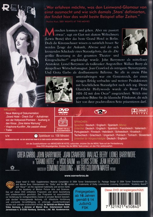 Menschen kommen und gehen. Aber nie passiert etwas, sagt ein Gast mit akuten Weltschmerz über das beste Grand Hotel in Berlin. Doch die Kinozuschauer wissen es natürlich besser. Sie werden Zeuge der Ankunft, Abreise und der sich kreuzenden Schicksale eines Staraufgebots, das als "Die grösste Besetzung in der gesamten Theater- und Kinogeschichte!" angekündigt wurde. John Barrymore als mittelloser Aristokrat. Lionel Barrymore als todkranker Angestellter. Wallace Beery als skrupelloser Wirtschaftsmagnat. Joan Crawford als intrigante Stenotypistin. Und Greta Garbo als desillusionierte Ballerina. Sie alle in einem Film unterzubringen war ein Geniestreich, der einen riesigen Erfolg verbuchte und weitere Produktionen mit beachtlichem Staraufgebot nach sich zog. Dieses Glanzlicht Hollywoods wurde als Bester Film 1931-32 mit dem Oscar ausgezeichnet. Welch eine grandiose Bühne für die klassische Filmkunst, die sich hier von ihrer prachtvollsten Seite präsentieren darf.