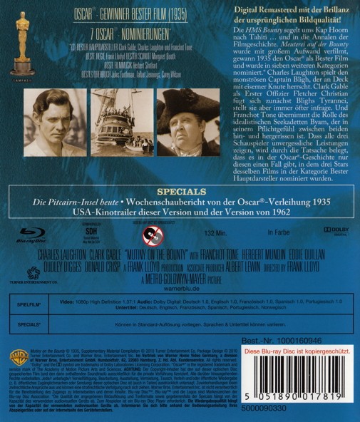 Die HMS Bounty segelt um das Kap Horn bis nach Tahiti... und direkt auf die Liste der 100 besten amerikanischen Filme, zusammengestellt vom American Film Institute. Die prunkvolle Verfilmung von Meuterei auf der Bounty wurde 1935 mit dem Oscar als Bester Film belohnt und erhielt insgesamt acht Nominierungen. Charles Laughton spielt Captain Bligh, ein Monster in Menschengestalt, das die Disziplin nur mit der Knute aufrecht erhält. Mit der Rolle des Ersten Offiziers Fletcher Christian zementierte Clark Gable seinen Status als Hollywoods Superstar - Blighs tyrannisches Kommando kann Christian schließlich nicht mehr unwidersprochen hinnehmen. Und Franchot Tone stellt den idealistischen Seekadetten Byam dar, der unmöglich beiden Vorgesetzten gerecht werden kann. Dass alle drei Darsteller hervorragende Leistungen liefern, belegt ein Rekord: Nur einmal in der Oscar-Geschichte wurden drei Stars desselben Films in der Kategorie Bester Darsteller nominiert.