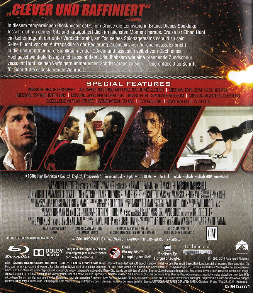 Cruise spielt den Geheimagenten Ethan Hunt, der miterleben muss, wie seine Kollegen bei diesem Einsatz zu Tode kommen. Bei einem Treffen mit seinem Kontaktmann der CIA erkennt Hunt, dass hinter der Mission ein perfides Doppelspiel steckt. Als Überlebenden wird ihm die Schuld am Tod seines Teams angehängt. Um seine Unschuld zu beweisen, muss Hunt den wahren Maulwurf finden. Ob auf der Flucht vor Killerkommandos der Regierung, beim Eindringen in den Hochsicherheitstrakt der CIA oder gar am Dach eines Hochgeschwindigkeitszuges festgeklammert, Hunt muss alles daransetzen, seinen Verfolgern stets einen Schritt voraus zu sein und der schrecklichen Wahrheit Schritt für Schritt näher zu kommen...