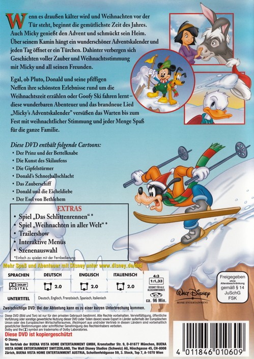 Egal, ob Pluto, Donald und seine pfiffigen Neffen ihre schönsten Erlebnisse rund um die Weihnachtszeit erzählen oder Goofy Ski fahren lernt - diese wunderbaren Abenteuer und das brandneue Lied "Micky's Adventskalender" versüssen das Warten bis zum Fest mit weihnachtlicher Stimmung und jeder Menge Spass für die ganze Familie.
