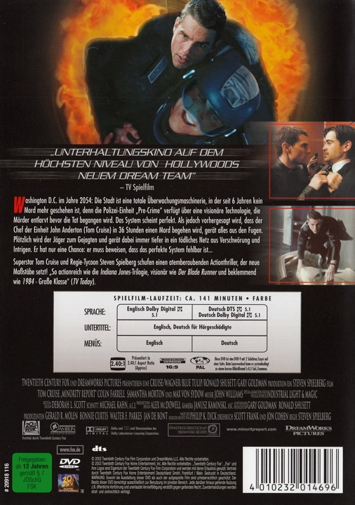 Washington D.C. im Jahre 2054: Die Stadt ist eine totale Überwachungsmaschinerie, in der seit 6 Jahren kein Mord mehr geschehen ist. Die Polizei-Einheit "Pre-Crime" verfügt über eine visionäre Technologie, die Mörder entlarvt, bevor die Tat gegangen wird. Das System scheint perfekt. Als jedoch vorhergesagt wird, dass der Chef der Einheit John Anderton in 36 Stunden einen Mord begehen wird, gerät alles aus den Fugen. Plötzlich wird der Jäger zum Gejagten und gerät dabei immer tiefer in ein tödliches Netz aus Verschwörung und Intrigen. Er hat nur eine Chance: er muss beweisen, dass das perfekte System fehlbar ist...