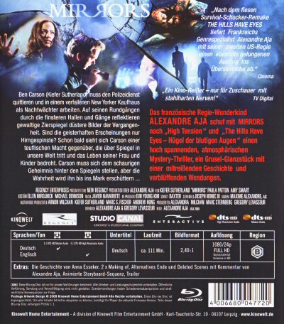 Ben Carson (Kiefer Sutherland) muss den Polizeidienst quittieren und in einem verfallenen New Yorker Kaufhaus als Nachtwächter arbeiten. Auf seinen Rundgängen durch die finsteren Hallen und Gänge reflektieren gewaltige Zierspiegel düstere Bilder der Vergangenheit. Sind die geisterhaften Erscheinungen nur Hirngespinste? Schon bald sieht sich Carson einer teuflischen Macht gegenüber, die über Spiegel in unsere Welt tritt und das Leben seiner Frau und Kinder bedroht. Carson muss sich dem schaurigen Geheimnis hinter den Spiegeln stellen, aber die Wahrheit wird ihn bis ins Mark erschüttern...
