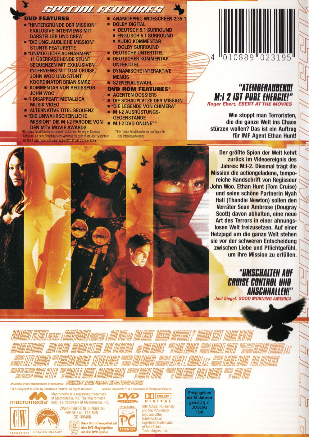 Der grösste Spion der Welt kehrt zurück im Videoereignis des Jahres: M:I-2. Diesmal trägt die Mission die actiongeladene, temporeiche Handschrift von Regisseur John Woo. Ethan Hunt (Tom Cruise) und seine schöne Partnerin Nyah Hall (Thandie Newton) sollen den Verräter Sean Ambrose (Dougray Scott) davon abhalten, eine neue Art des Terrors in einer ahnungslosen Welt freizusetzen. Auf einer Hetzjagd um die ganze Welt stehen sie vor der schweren Entscheidung zwischen Liebe und Pflichtgefühl, um Ihre Mission zu erfüllen.