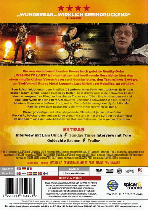 Der von der internationalen Presse hoch gelobte Film "Mission to Lars" wurde produziert von William Spicer und James Moore, die auch Regie geführt haben. Der Film zeigt die Geschichte der Geschwister Kate und William Spicer, die ihrem Bruder Tom seinen absoluten Traum erfüllen möchten: einmal seinen "Rock-Gott" Lars Ulrich von der Band "Metallica" zu treffen. Das ist sowohl amüsant als auch bewegend, denn Tom leidet am "Fragilen X Syndrom", einer Form von Autismus. Er hat diesen langersehnten Traum seinen Helden zu treffen und seine Geschwister möchten ihm diesen Traum erfüllen. Sie erhoffen sich von dem Road Trip einfach eine gute Zeit und wünschen sich die Entstehung einer tiefen Verbindung untereinander. Viele Male droht der Plan zu scheitern, mal an Toms Krankheit, der dysfunktionalen Familie oder dem Backstage-Labyrinth einer Heavy Metal-Supergroup. Je näher Tom seinem Ziel kommt, umso mehr strahlt er. Ein mitreissender Film mit einem berührenden Finale.