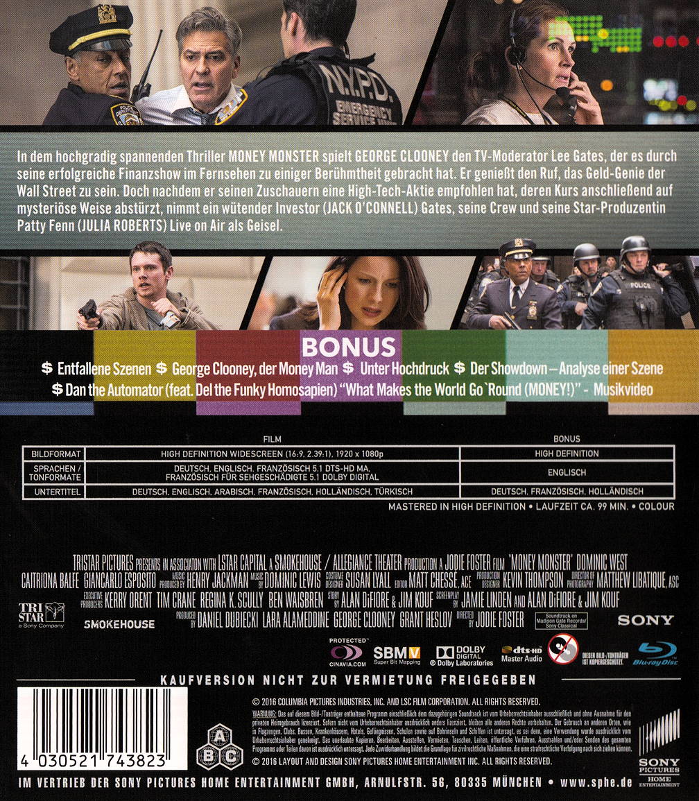 In dem hochgradig spannenden Thriller Money Monster spielt George Clooney den TV-Moderator Lee Gates, der es durch seine erfolgreiche FIanzshow im Fernsehen zu einiger Berühmtheit gebracht hat. Er geniesst den Ruf, das Geld-Genie der Wall Street zu sein. Doch nachdem er seinen Zuschauern eine High-Tech-Aktie empfohlen hat, deren Kurs anschliessend auf mysteriöse Weise abstürzt, nimmt ein wütender Investor Gates, seine Crew und seine Star-Produzentin Patty Fenn Live on Air als Geisel. Der Film zeigt in Realzeit, wie Gates und Fenn verzweifelt versuchen, am Leben zu bleiben und gleichzeitig die Wahrheit hinter einem Netz aus Lügen rund um das "grosse Geld" aufzudecken.