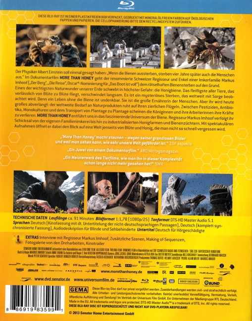 Eines der wichtigsten Naturwunder unserer Erde schwebt in höchster Gefahr: die Honigbiene. Das fleissigste aller Tiere, das verlässlich von Blüte zu Blüte fliegt, verschwindet langsam. Es ist ein mysteriöses Sterben, das weltweit mit Sorge beobachtet wird. Denn ein Leben ohne die Biene ist undenkbar. Sie ist die grosse Ernährerin der Menschen. Aber ihr wird heute Grosses abverlangt: der weltweite Bedarf an Naturprodukten ruht auf ihren zierlichen Flügeln. Zwischen Pestiziden, Antibiotika, Monokulturen und dem Transport von Plantage zu Plantage scheinen die Königinnen und ihre Arbeiterinnen ihre Kräfte zu verlieren. "More than Honey" entführt uns in das faszinierende Universum der Biene. Regisseur Markus Imhoof verfolgt ihr Schicksal von der eigenen Familienimkerei bis hin zu industrialisierten Honigfarmen und Bienenzüchtern. Mit spektakulären Aufnahmen öffnet er dabei den Blick auf eine Welt jenseits von Blüte und Honig, die man nicht so schnell vergessen wird.