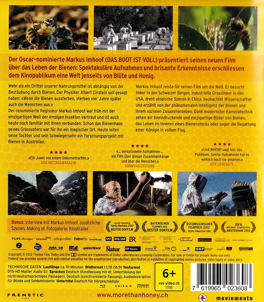 Eines der wichtigsten Naturwunder unserer Erde schwebt in höchster Gefahr: die Honigbiene. Das fleissigste aller Tiere, das verlässlich von Blüte zu Blüte fliegt, verschwindet langsam. Es ist ein mysteriöses Sterben, das weltweit mit Sorge beobachtet wird. Denn ein Leben ohne die Biene ist undenkbar. Sie ist die grosse Ernährerin der Menschen. Aber ihr wird heute Grosses abverlangt: der weltweite Bedarf an Naturprodukten ruht auf ihren zierlichen Flügeln. Zwischen Pestiziden, Antibiotika, Monokulturen und dem Transport von Plantage zu Plantage scheinen die Königinnen und ihre Arbeiterinnen ihre Kräfte zu verlieren. "More than Honey" entführt uns in das faszinierende Universum der Biene. Regisseur Markus Imhoof verfolgt ihr Schicksal von der eigenen Familienimkerei bis hin zu industrialisierten Honigfarmen und Bienenzüchtern. Mit spektakulären Aufnahmen öffnet er dabei den Blick auf eine Welt jenseits von Blüte und Honig, die man nicht so schnell vergessen wird.