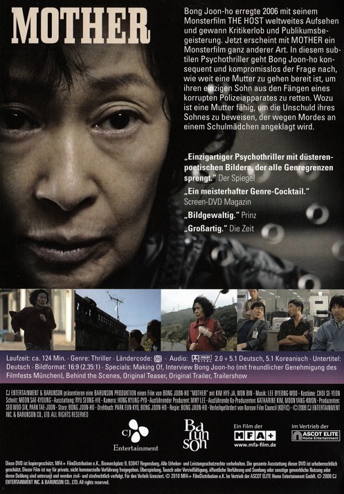 Jetzt erscheint mit MOTHER ein Monsterfilm ganz anderer Art in die Kinos. In diesem subtilen Psychothriller geht Bong Joon-ho konsequent und kompromisslos der Frage nach, wie weit eine Mutter zu gehen bereit ist, um ihren einzigen Sohn aus den Fängen eines korrupten Polizeiapparates zu retten. Wozu ist eine Mutter fähig, um die Unschuld ihres Sohnes zu beweisen, der wegen Mordes an einem Schulmädchen angeklagt wird?