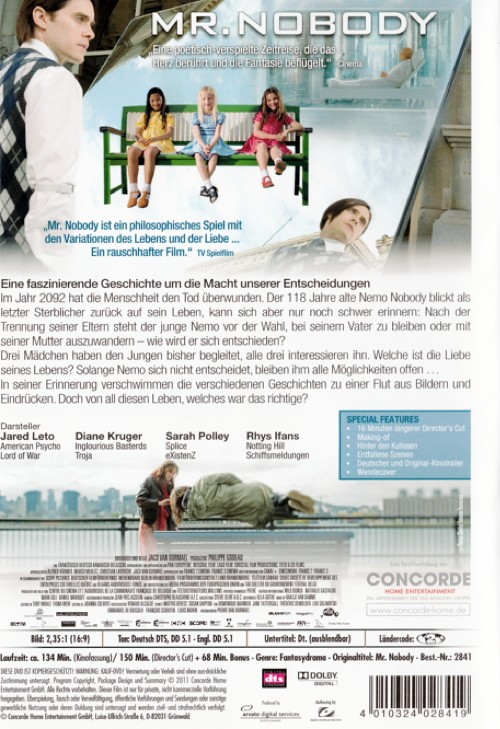 Nemo Nobody führt ein ganz normales Leben mit seiner Frau Elise und seinen drei Kindern. Eines Tages jedoch wacht er auf und ist 120 Jahre alt. Es ist das Jahr 2092 und Mr. Nobody ist der letzte Sterbliche in einer Gesellschaft, die durch Wissenschaft und Forschung die Unsterblichkeit erlangt hat. Einem Journalisten berichtet er rückblickend von seinem Leben. Doch erzählt er dabei nicht wie sein Leben verlaufen ist, sondern wie es hätte verlaufen können - drei Varianten von Nemos Leben, jede auf ihre Art bizarr und phantastisch. Als alter Mann blickt er nun darauf zurück, denn er weiß: Jedes einzelne dieser Leben verdiente es, gelebt zu werden.