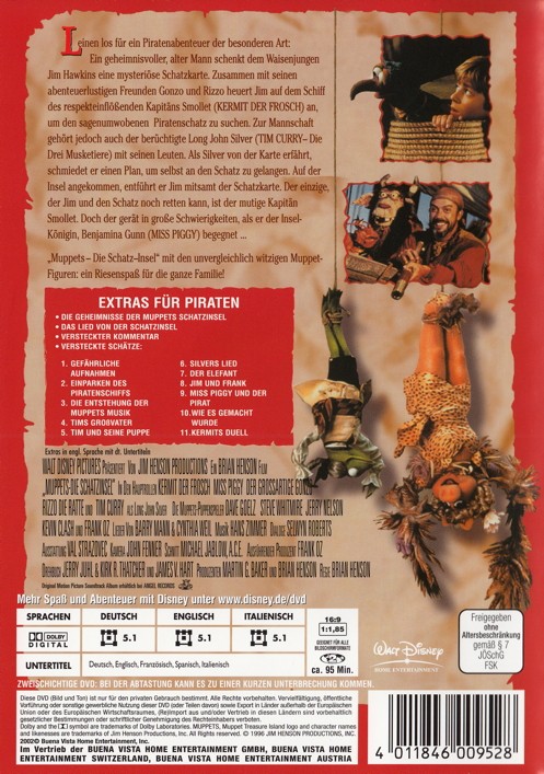 Leinen los für ein Piraten-Abenteuer der besonderen Art: Ein geheimnisvoller alter Mann schenkt dem Waisenjungen Jim Hawkins eine mysteriöse Schatzkarte. Zusammen mit seinen abenteuerlustigen Freunden Gonzo und Rizzo heuert Jim auf dem Schiff des respekteinflössenden Kapitän Smollet (Kermit der Frosch) an, um den sagenumwobenen Piratenschatz zu suchen. Zur Mannschaft gehört jedoch auch der berüchtigte Pirat Long John Sliver (Tim Curry - Die Drei Musketiere) mit seinen Leuten. Als Sliver von der Karte erfährt, schmiedet er einen Plan, um selbst an den Goldschatz zu gelangen. Auf der Insel angekommen, entführt er Jim mitsamt der Schatzkarte. Der einzige, der Jim und den Schatz retten kann, ist der mutige Kapitän Smollet. Doch der gerät in grosse Schwierigkeiten, als er der Insel-Königin der Warzenschweine Benjamina Gunn (Miss Piggy) begegnet...