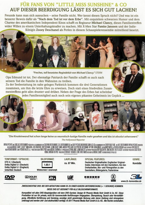 Freunde kann man sich aussuchen - seine Familie nicht. Wer kennt diesen Spruch nicht? Und was ist ein besserer Beweis dafür als ""Nach dem Tod ist vor dem Erbe"". Mit exquisitem schwarzem Humor und dem Charme des amerikanischen Independent Kinos schafft es Regisseur Michael Clancy, dieses Familientreffen wider Willen zu einem Unterhaltungsknaller zu machen. Mit X-Men Star Famke Janssen und der Indie-Königin Zooey Deschanel als Perlen in diesem Schauspielerensemble mitreißend besetzt.