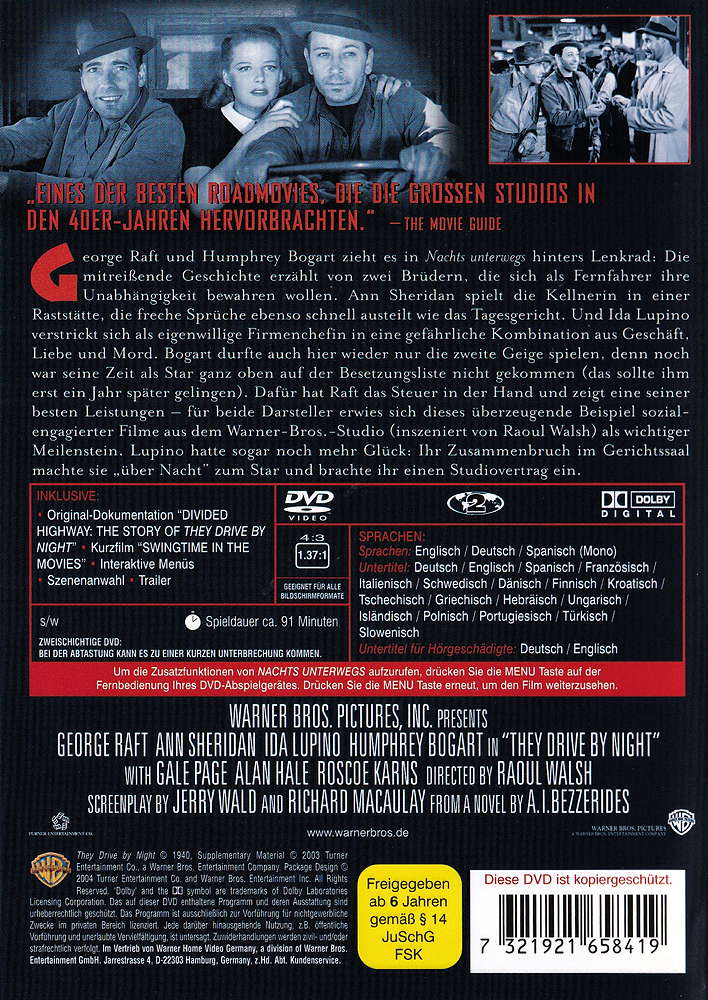 George Raft und Humphrey Bogart zieht es in Nachts unterwegs hinters Lenkrad: Die mitreissende Geschichte erzählt von zwei Brüdern, die sich als Fernfahrer ihre Unabhängigkeit bewahren wollen. Ann Sheridan spielt die Kellnerin in einer Raststätte, die freche Sprüche ebenso schnell austeilt wie das Tagesgericht. Und Ida Lupino verstrickt sich als eigenwillige Firmenchefin in eine gefährliche Kombination aus Geschäft, Liebe und Mord. Bogart durfte auch hier wieder nur die zweite Geige spielen, denn noch war seine Zeit als Star ganz oben auf der Besetzungsliste nicht gekommen (das sollt eihm erst ein Jahr später gelingen). Dafür hat Raft das Steuer in der Hand und zeigt eine seiner besten Leistungen - für beide Darsteller erwies sich dieses überzeugende Beispiel sozialengagierter Filme aus dem Warner-Bros.-Studio (inszeniert von Raoul Walsh) als wichtiger Meilenstein. Lupino hatte sogar noch mehr Glück: Ihr Zusammenbruch im Gerichtssaal machte sie "über Nacht" zum Star und brachte ihr einen Studiovertrag ein.