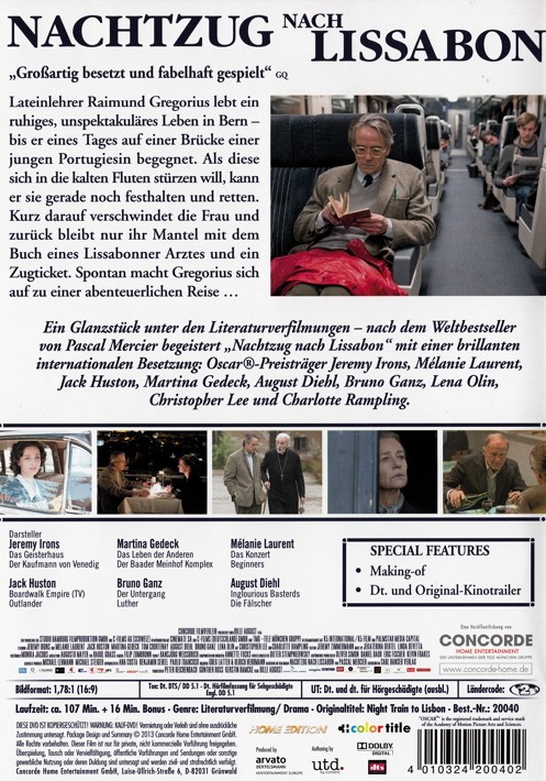 Lateinlehrer Raimund Gregorius lebt ein ruhiges, unspektakuläres Leben in Berg - bis er eines Tages auf einer Brücke einer jungen Portugiesin begegnet. Also diese sich in die kalten Fluten stürzen will, kann er sie gerade noch festhalten und retten. Kurz darauf verschwindet die Frau und zurück bleibt nur ihr Mantel mit dem Buch eines Lisbonner Arztes und ein Zugticket. Spontan macht Gregoruis sich auf zu einer abenteuerlichen Reise...