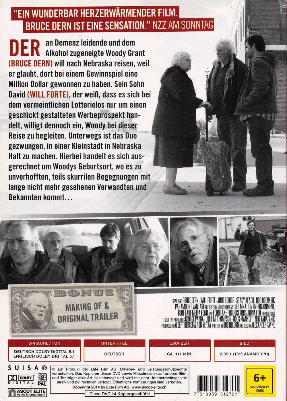 Der Weg ist hier definitiv nicht das Ziel, denn am Ende wartet ein Lottogewinn in Millionenhöhe. Das denkt zumindest der grantige Woody Grant (BRUCE DERN), der sich, getäuscht durch einen betrügerischen Werbeprospekt, das vermeintlich grosse Geld persönlich in Lincoln, Nebraska, abholen möchte. Doch die 900 Meilen Strecke von seinem Wohnort zum Ziel seiner Träume kann der Eigenbrötler allein nicht mehr bewältigen. Von seiner garstigen Gattin Kate (JUNE SQUIBB) und seinem verbitterten Sohn Ross (BOB ODENKIRK) ist keine Hilfe zu erwarten: Sie tragen ihm immer noch seine unrühmliche Säufer-Vergangenheit nach und würden ihn am liebsten in ein Heim stecken. Schliesslich erklärt sich sein jüngerer, gutmütiger Sohn David (WILL FORTE) dazu bereit, die Fahrt mit seinem Vater anzutreten - auch wenn die beiden schon lange nicht mehr viel miteinander zu tun haben. Bei einem ungeplanten Zwischenstopp in Woodys Geburtsstadt Hawthorne treffen sie auf ihre Verwandtschaft, alte Freunde und auch viele Neider, die sich vor allem für den neu gewonnenen Reichtum des seltenen Gastes interessieren.