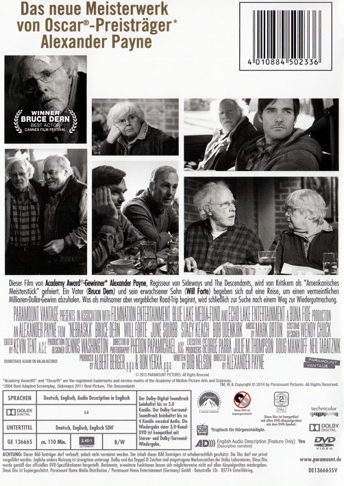 Bruce Dern, Will Forte, Rance Howard, Stacy Keach, Bob Odenkirk, June Squibb, Devin Ratray, Mary Louise Wilson, Franklin Dennis Jones, John Reynolds...Missy Doty, Anthony G. Schmidt, Scott Goodman, Jose Munoz, Ray Stevens, Gelndora Stitt, Ronald Vosta, Neal Freudenburg, Francisco Mendez, Dennis McCave, Tim Driscoll, Elizabeth Moore, Eula Freudenburg, Rachel Lynn Liester, Colleen O'Doherty, Kevin Kunkel, Catherine Rae Schutz, Melinda Simonsen, Sherry Ristow, Angela McEwan, Dennis McCoig, Jeffrey Yosten, Lois Nemec, Terry Lotrous, Noah Matteo, Roger Stuckwisch