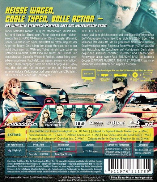 Tobey Marshall (Aaron Paul) ist Mechaniker, grösster Muscle-Car-Fan und illegaler Street-Racer. Als er sich mit dem reichen, arroganten Ex-NASCAR-Rennfahrer Dino Brewster (Dominic Cooper) zusammentut, um seine Werkstatt zu retten, beginnt der Ärger für Tobey. Dino hängt ihm einen Mord an, den er gar nicht begangen hat. Während Tobey für ein paar Jahre ins Gefängnis wandert, nutzt Dino die Gunst der Stunde und expandiert sein Geschäft. Wieder in Freiheit startet Tobey einen erbarmungslosen Rachefeldzug gegen seinen ehemaligen Partner. Als dieser von Tobeys Plan Wind bekommt, setzt er ein hohes Kopfgeld auf ihn aus. Von nun an liefert sich Tobey nicht nur mit der Polizei eine schonungslose Verfolgungsjagd quer durch die USA. Ein Rennen auf Leben und Tod beginnt.
