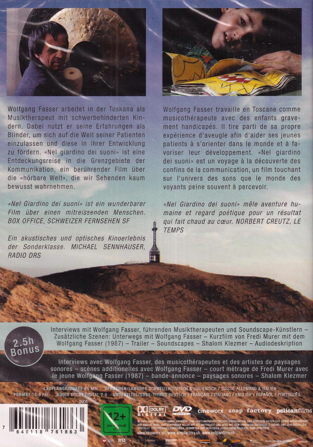 «Nel giardino dei suoni» zeichnet ein Porträt des Musikers, Therapeuten und Klangforschers Wolfgang Fasser, der als Jugendlicher das Augenlicht verloren hat. Auf dem Weg in die Dunkelheit entdeckte der Glarner die Welt der Geräusche, Klänge und Töne, die eine Art Paralleluniversum zu unserer optisch geprägten Realität bildet.Wolfgang Fasser arbeitet als Musiktherapeut in der Toskana mit schwerbehinderten Kindern. In eindringlichen und poetischen Bildern erzählt der Film die ungewöhnliche Geschichte eines Menschen, der die eigene Lebenserfahrung als Blinder nutzt, um seinen jungen Patienten zu helfen, sich auf die Welt einzulassen und ihre individuellen Möglichkeiten auszuschöpfen. «Nel giardino dei suoni» («Im Garten der Klänge») ist eine Entdeckungsreise in die Grenzgebiete der Kommunikation, ein leiser und berührender Film über die «hörbare Welt», die wir Sehenden normalerweise nicht oder kaum bewusst wahrnehmen.