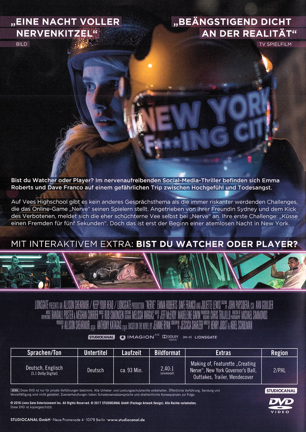 Bist du Watcher oder Player? Auf Vees Highschool gibt es so gut wie kein anderes Gesprächsthema mehr als die immer riskanter werdenden Challenges, die das illegale Online-Game "Nerve" seinen Spielern stellt. Um ebenso wie ihre Freundin Sydney einmal im Mittelpunkt zu stehen, meldet sich die eher schüchterne Vee kurzentschlossen selbst bei "Nerve" an. Angetrieben vom Kick des Verbotenen bricht Vee mit ihrem ebenso attraktiven wie mysteriösen Game-Partner Ian schnell alle Tabus: keine Challenge ist ihnen zu riskant...