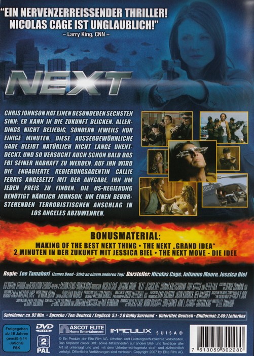 Chris Johnson hat einen besonderen sechsten Sinn: Er kann in die Zukunft blicken. Allerdings nicht beliebig, sondern jeweils nur einige Minuten. Diese aussergewöhnliche Gabe bleibt natürlich nicht lange unentdeckt. Und so versucht auch schon bald das FBI seiner habhaft zu werden. Auf ihn wird die engagierte Regierungsagentin Callie Ferris angesetzt mit der Aufgabe, ihn um jeden Preis zu finden. Die US-Regierung benötigt nämlich Johnson, um einen bevorstehenden terroristischen Anschlag in Los Angeles abzuwehren.