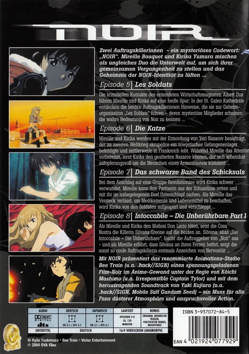 Die kriminellen Kontakte des ermordeten Wirtschaftsmagnaten Albert Dux führen Mireille und Kirika auf eine heiße Spur: In der St. Galen Kathedrale entdecken die beiden Auftragskillerinnen Hinweise, die sie zur Geheimorganisation "Les Soldats" führen - deren mysteriöse Mitglieder scheinen die wahre Bedeutung von Noir zu kennen.