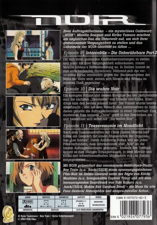 Ein korrupter Polizist und dessen Komplize bei der Justizbehörde sind die nächsten "Zielobjekte" von Mireille und Kirika. Allerdings kam den beiden jemand zuvor: Der Polizist wurde bereits umgebracht - und bei dem Versuch den Justizbeamten zu liquidieren geraten die Auftragskillerinnen in einen Hinterhalt: Eine mysteriöse Frau namens "Chloe" greift in das Geschehen ein - und bezeichnet sich selbst als "die wahre Noir"...